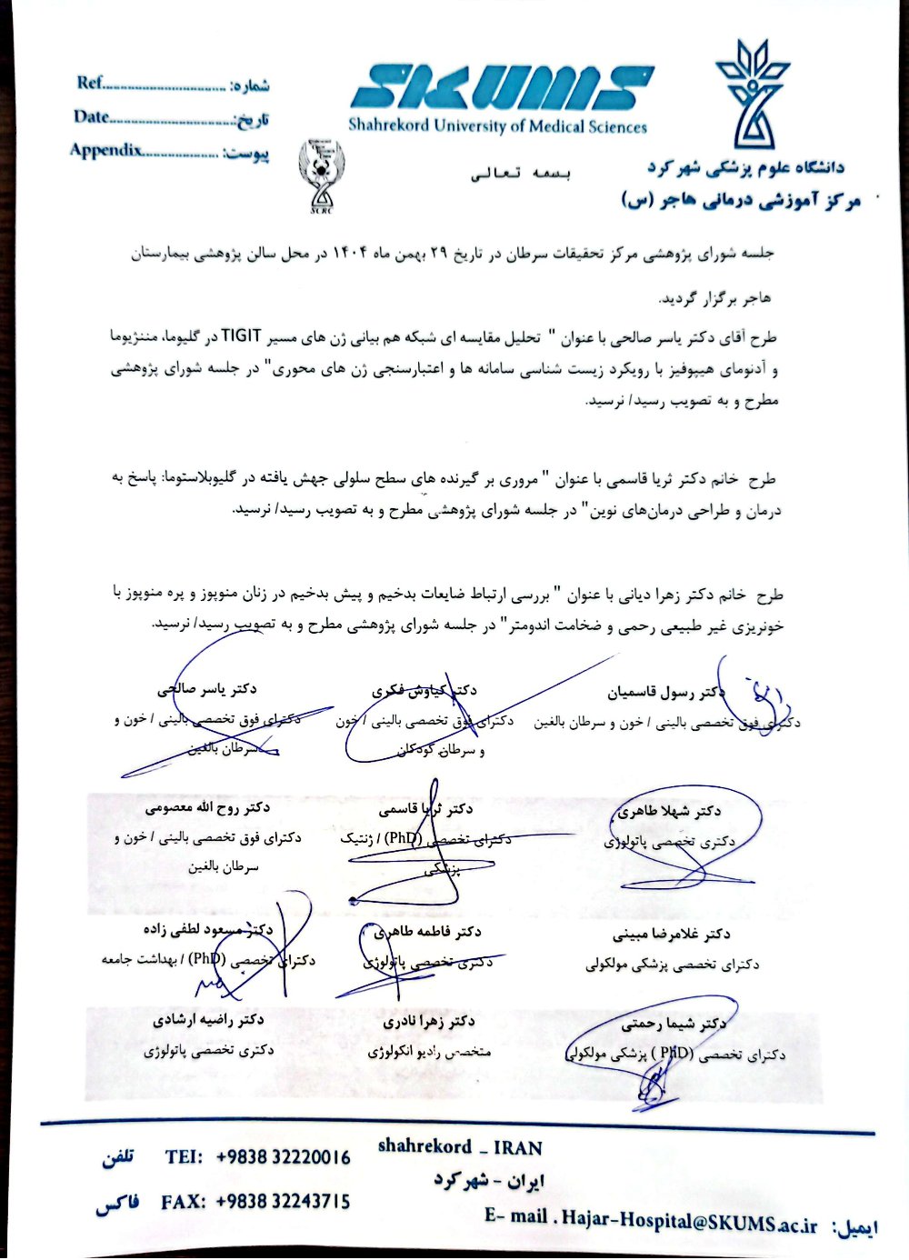 • آدرس:  شهرکرد، بیمارستان هاجر، ساختمان اداری طبقه دوم روبروی حسابداری، مرکز تحقیقات سرطان